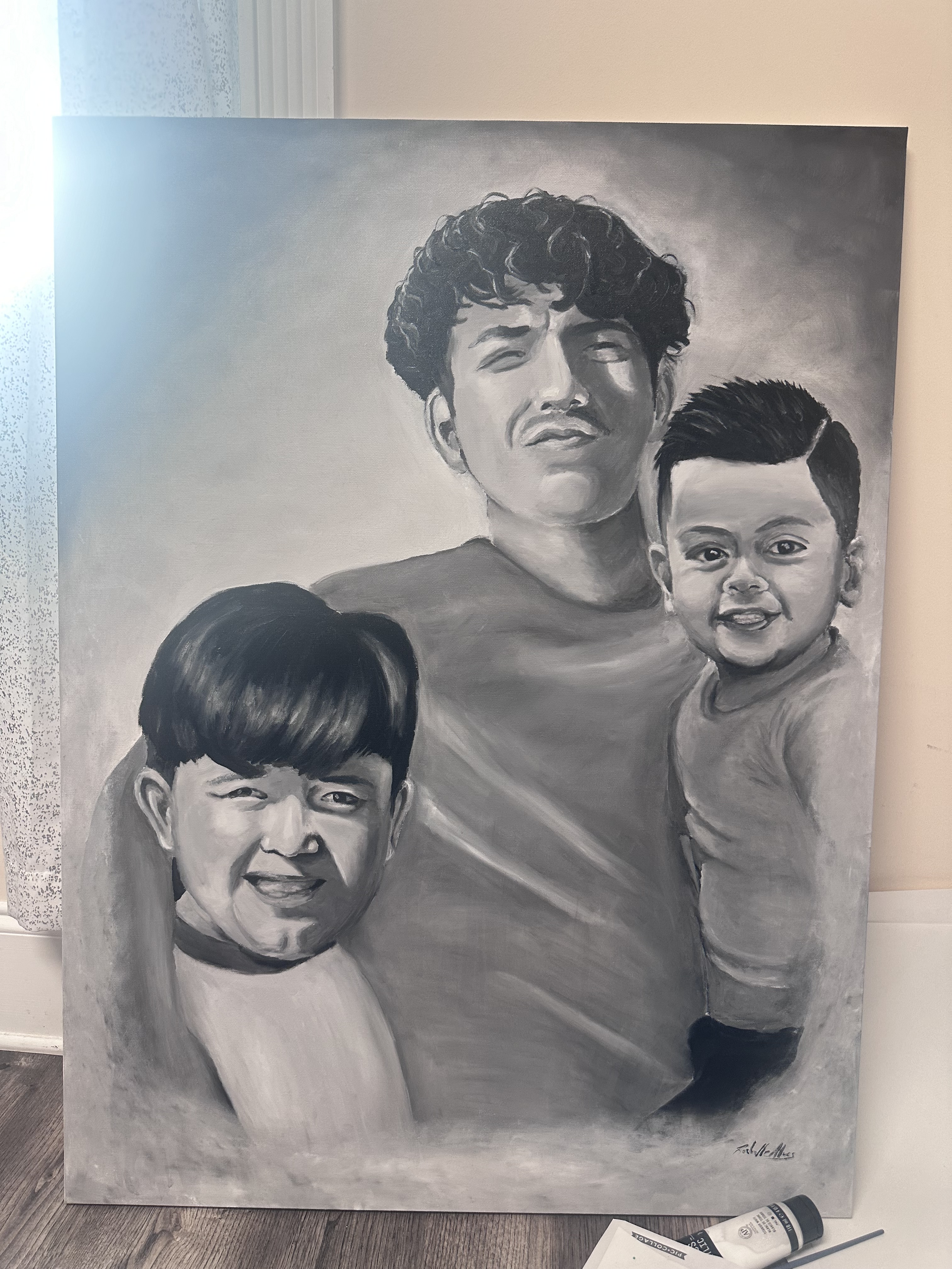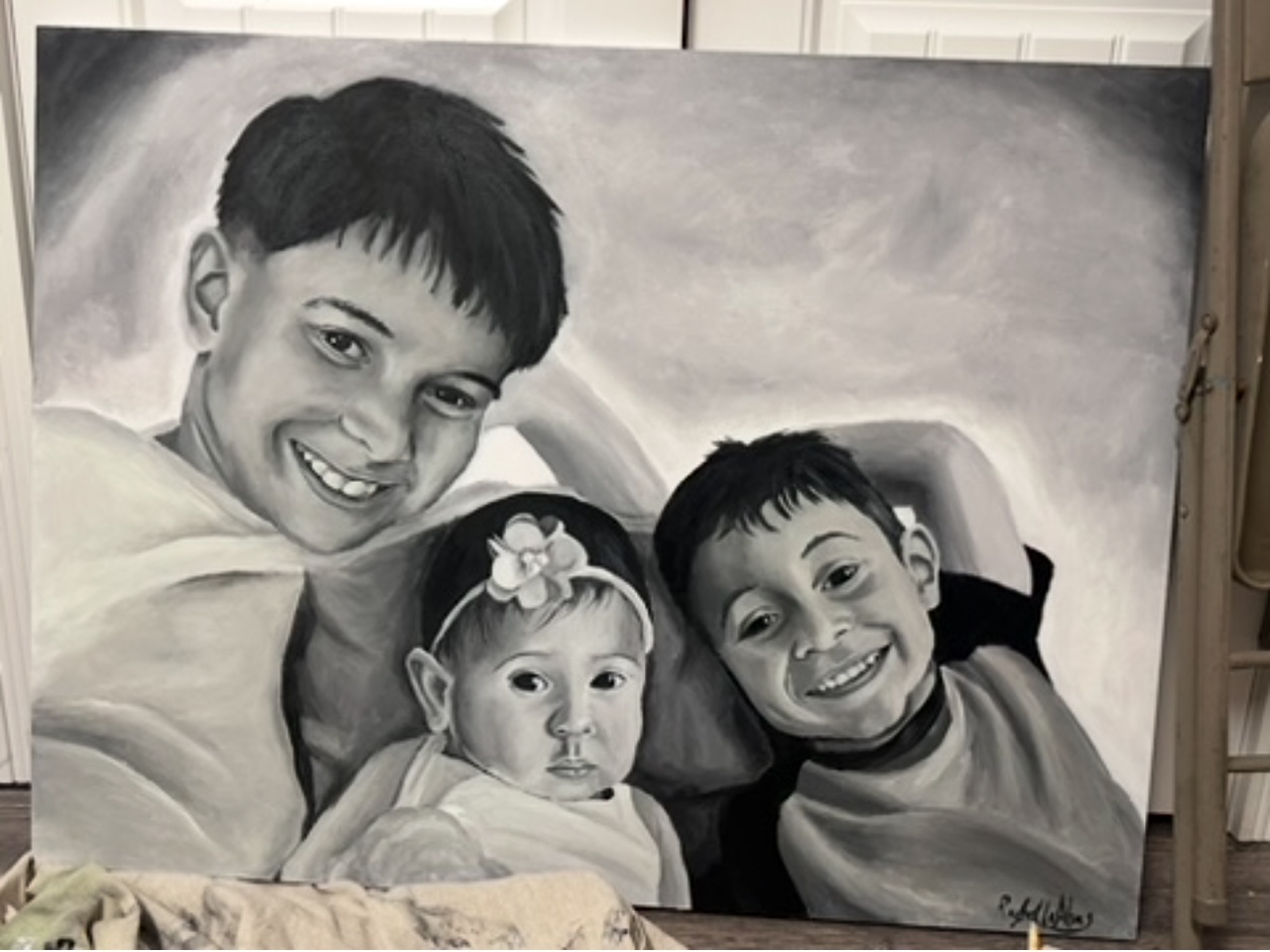 Imagine having the power to bring together the faces you love – no matter how far apart they are – into one breathtaking work of art. This portrait was created from four separate photos, beautifully blended into a single masterpiece capturing three children who had never shared a photo together. A one-of-a-kind painting that turns distance into closeness and memories into something you can hold forever.